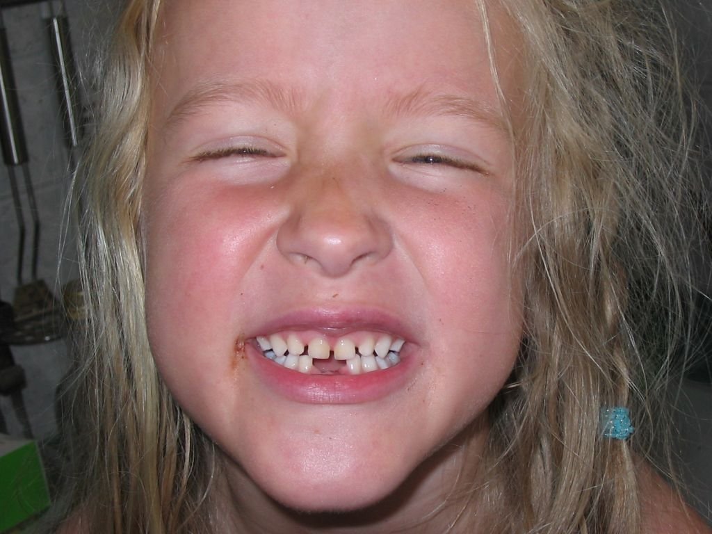 Trots en stoer laat ze de het gat zien wat de twee tanden achter hebben gelaten.